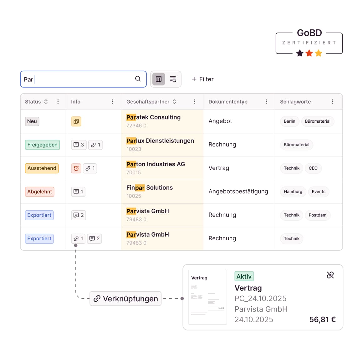 Ob Rechnungen, Verträge oder Lieferscheine – mit der Dokumentenverwaltung von Candis bieten wir dir ein Archiv mit Zukunft. Hier kannst du alle Dokumente aus deiner Finanzbuchhaltung ablegen, miteinander verknüpfen, sortieren – und auch schnell wiederfinden. Jederzeit.