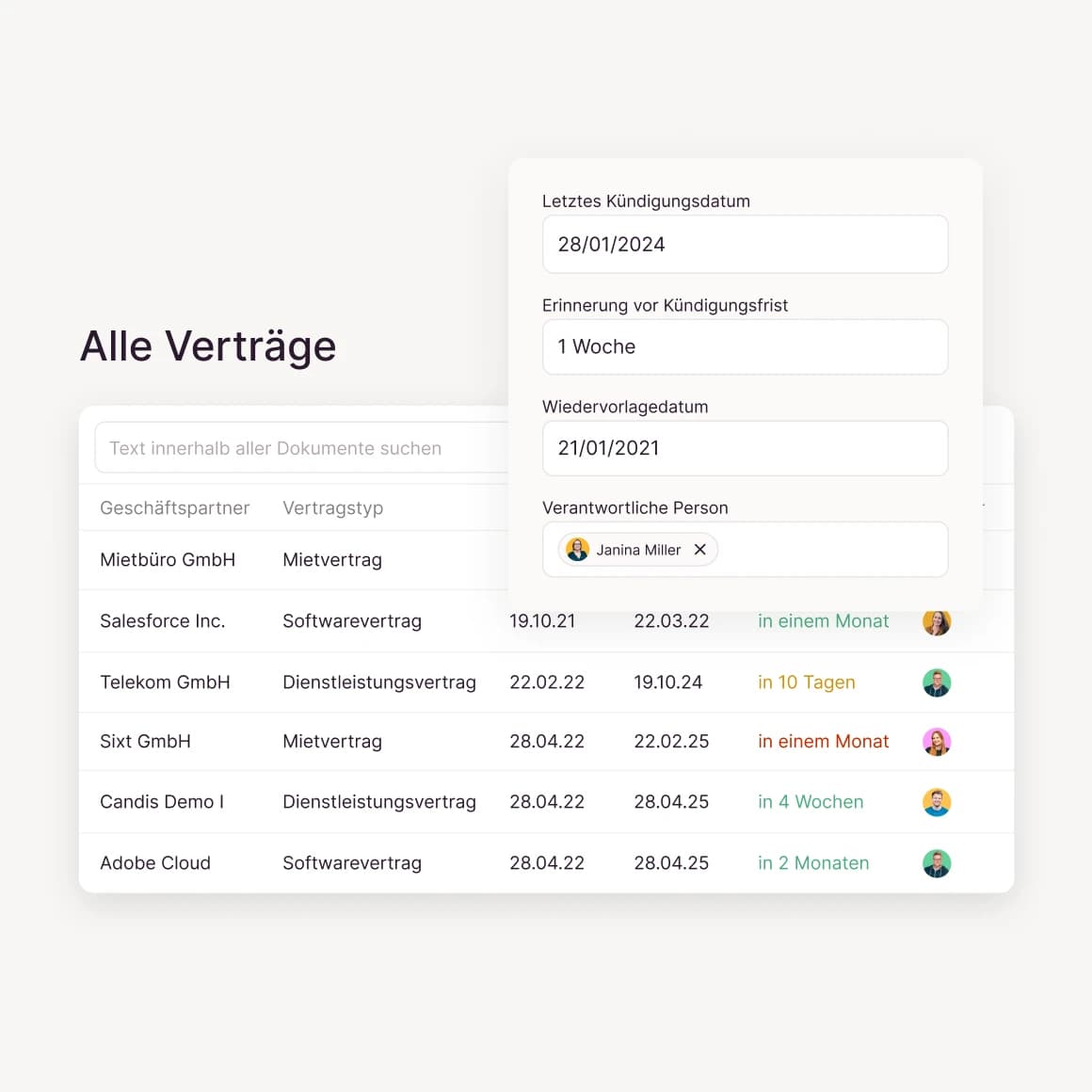 Mit Candis als deine Vertragsmanagement-Software hast du direkten Zugriff auf alle deine Verträge, bindest sie mit der Dokumentenverknüpfung schnell in Freigabeprozesse ein und verpasst keine Fristen mittels der automatischen Erinnerungsfunktion zur Wiedervorlage.
