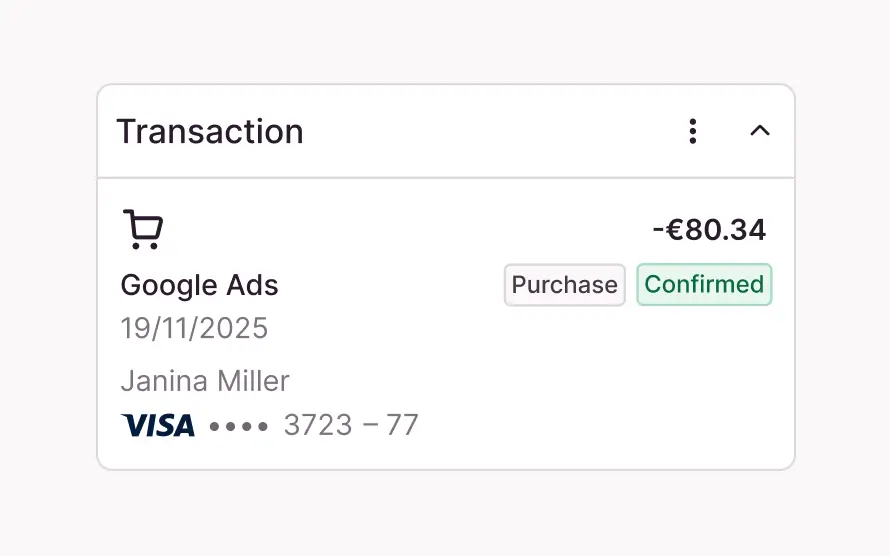Your finances, your rules: Whether for individual departments, projects or events – with Candis Visa Credit Cards you always have an overview of all transactions, in real time.