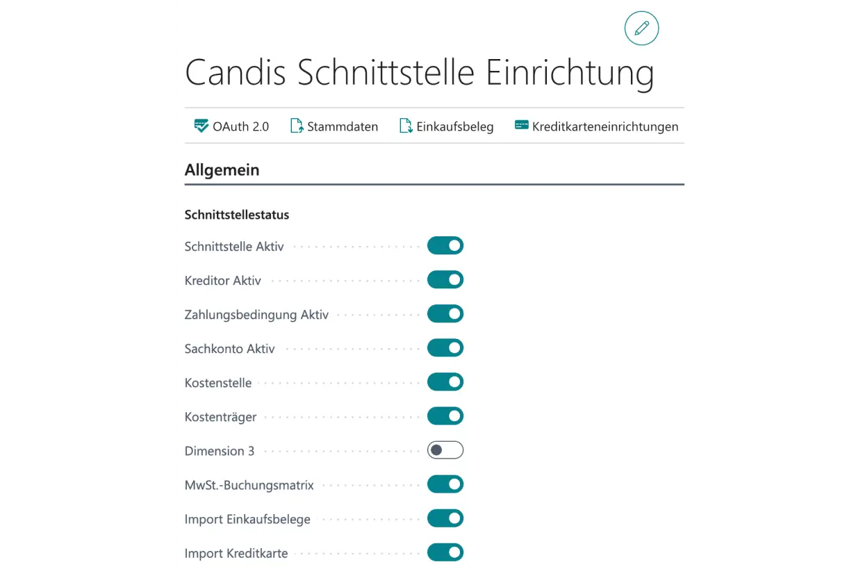 Sobald du den Wizard abgeschlossen und Candis autorisiert hast, findest du in Business Central die Schnittstelleneinrichtung. Dort siehst du den Status der Verbindung, die verknüpfte Candis Organisation und einige Einstellungen, die bestimmen, wie Daten zwischen beiden Systemen übertragen werden.