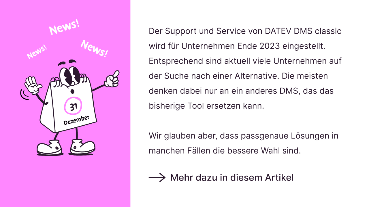 Viele Unternehmen nutzen Dokumentenmanagement Systeme, kurz DMS, und hoffen, ihre Prozesse so digital abgebildet zu bekommen. Das kann die Software in einigen Fällen allerdings nicht leisten, beliebt ist sie trotzdem noch, weil es sie seit 20 Jahren gibt und die meisten Unternehmen noch nie über eine Alternative nachgedacht haben. Dazu sehen sich Kund:innen des DATEV DMS classic aktuell allerdings gezwungen: Ab Ende 2023 bietet DATEV den Support sowie den Service nicht mehr an.