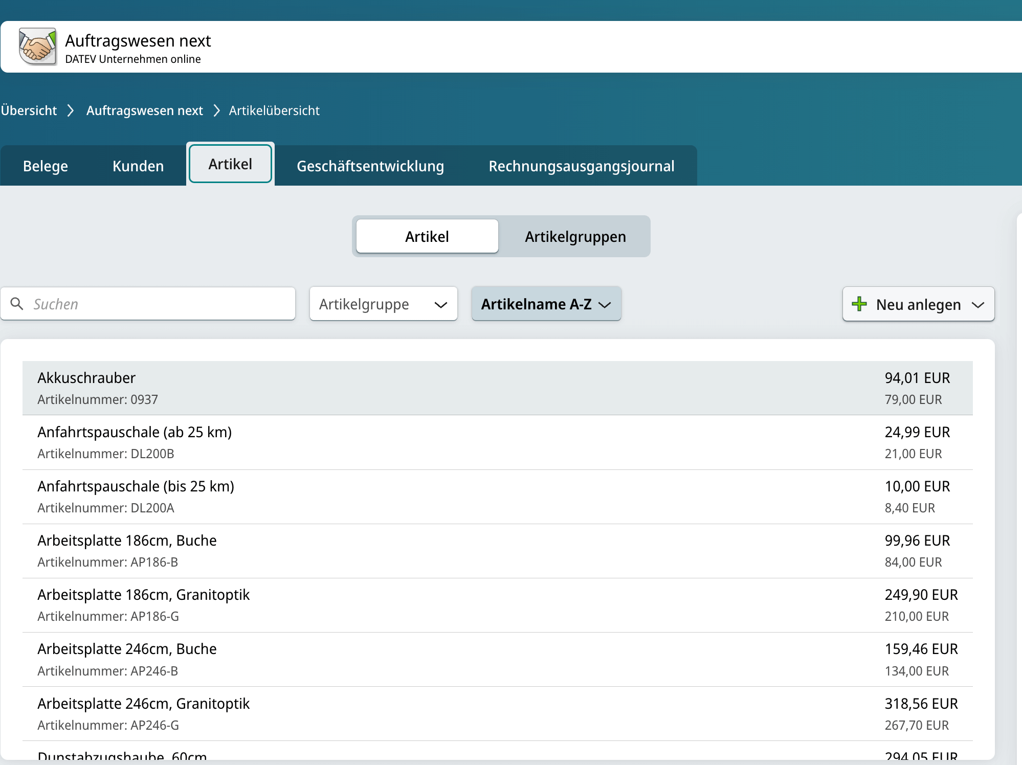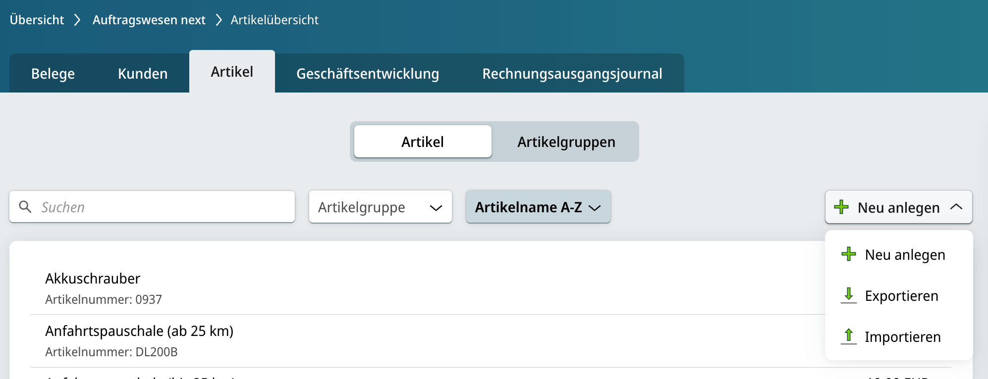 Damit Rechnungen erstellt werden können, müssen zunächst Artikel angelegt werden. Das ist möglich:
