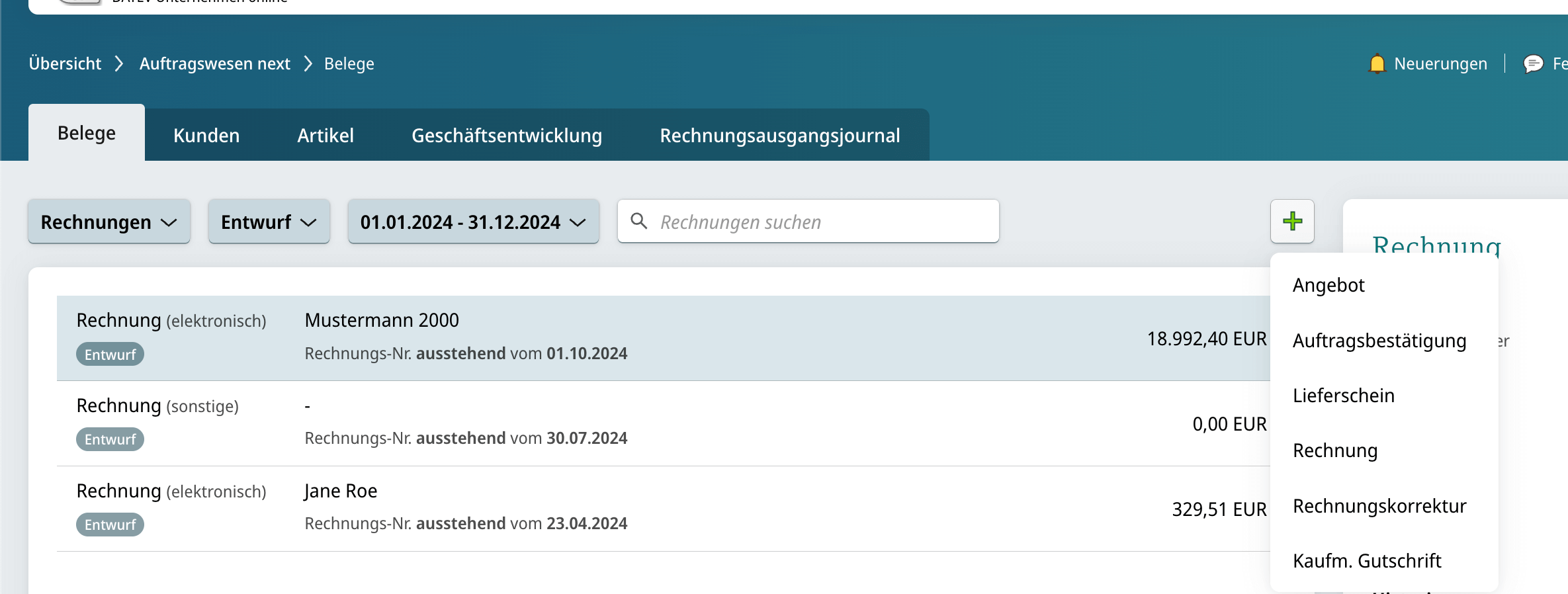 Mit DATEV Auftragswesen next lassen sich unter anderem folgende Belege erstellen: