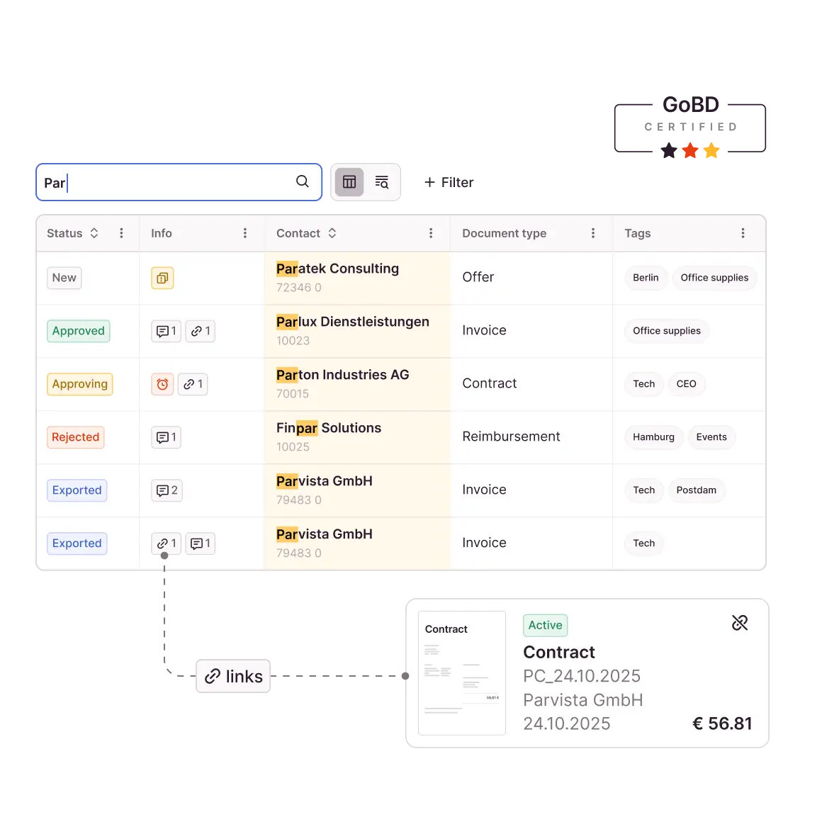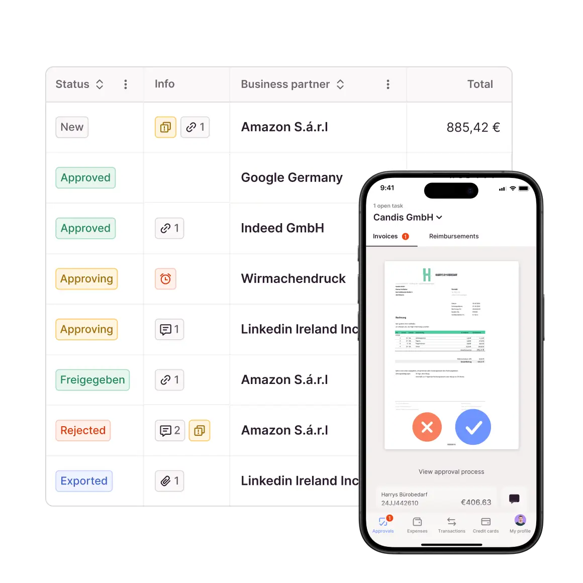 Store all incoming invoices, receipts, travel expenses, reimbursements, and contracts in one place — automatically captured by AI, approved effortlessly through customizable workflows, seamlessly exported, and archived in full GoBD compliance. That’s Candis.
