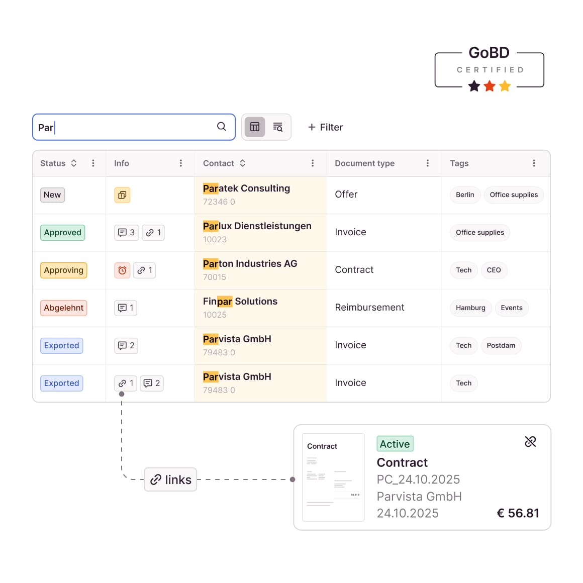 Whether invoices, contracts or delivery notes - with Candis document management, we offer you an archive that is here to stay. You can store, link and sort all documents from your financial accounting there – and find them again quickly. At any time.