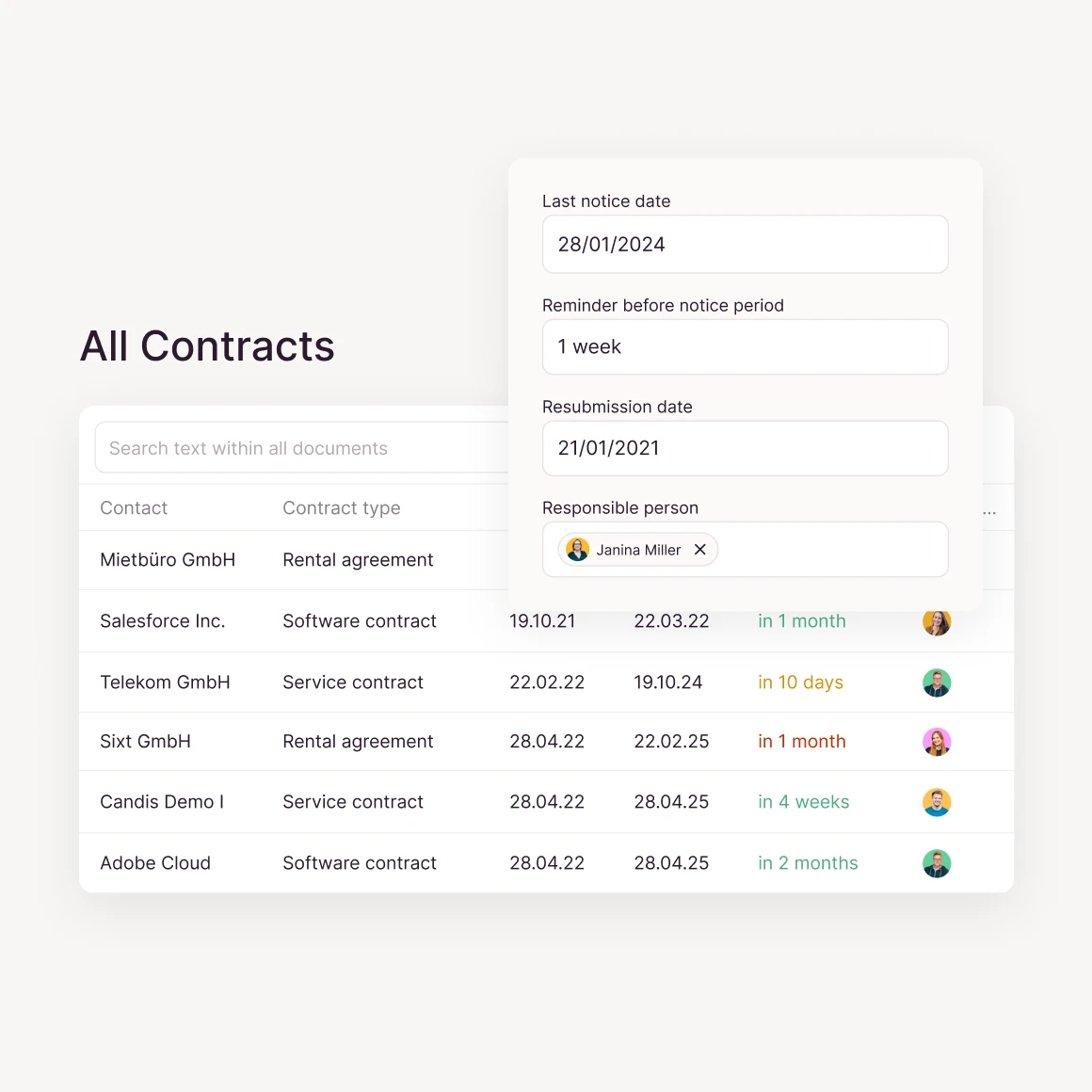 with reminders for terms + cancellation periods.