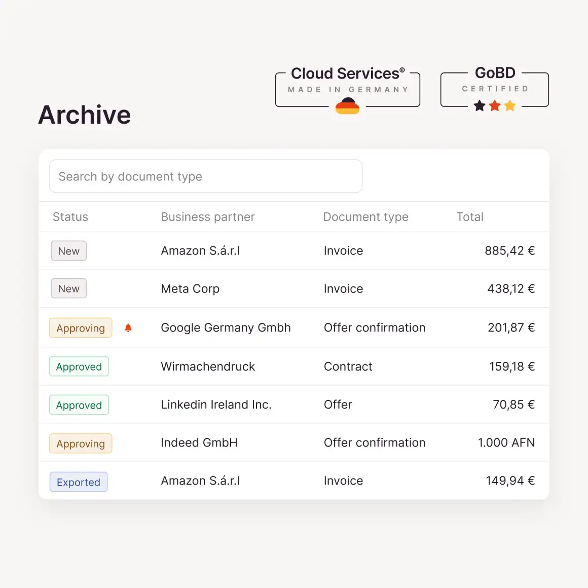 Candis stores invoices and receipts in the cloud in an audit-proof manner. Every change, every access, and every approval step is documented in the document history. Completely traceable—at any time.