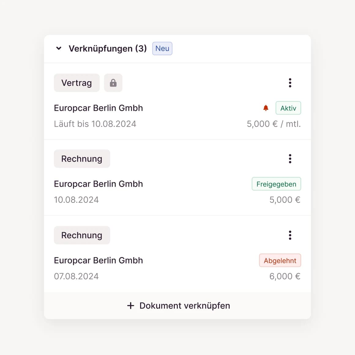 Ob Vertrag, Angebot oder Rechnung – in Candis bringst du zusammen, was zusammengehört. Durch die Verknüpfung relevanter Dokumente entsteht ein durchgängiger Zusammenhang, der nicht nur nachvollziehbar ist, sondern direkt im Kontext angezeigt wird.